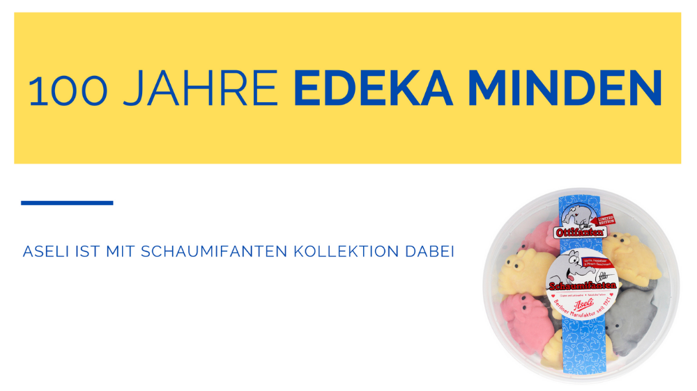 Im Jahr 1920 gründeten 34 Kolonialwarenhändler die Genossenschaft und setzten damit den Grundstein für den Verbund EDEKA Minden-Hannover wie man ihn heutzutage kennt. Gefeiert wird vor allem die Veränderung der Marke vom Tante-Emma-Geschäft hin zu großen SB-Märkten mit mehreren tausend Artikeln im Sortiment. Damals wie heute setzt EDEKA den Fokus auf Qualität und Frische bei den Lebensmitteln und hat Einkaufen zu einem Erlebnis weiterentwickelt. Doch nicht nur rosige Zeiten hat das EDEKA Center Minden hinter sich. So ist sie im Jahr 1945 von Bombenschäden und Plünderungen betroffen gewesen. Im Jahr 2005 startete dann die jüngste Kampagne „Wir lieben Lebensmittel“, die ein moderneres Image verkörpert. Zu den Aktionen und Gewinnspielen des Jubiläums, das übrigens das ganze Jahr über gefeiert wird, gehören auch die kultigen Produkte in Ottos Offitfanten-Design – über Rapshonig, Nudeln, Schokolade, Nuggets bis hin zu Aselis Limited Edition – den Schaumifanten.